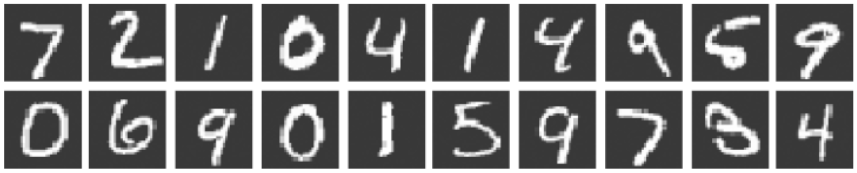 MNIST의 이미지 데이터는 28 X 28 크기의 회색조 이미지이며, 각 픽셀은 0에서 255까지의 값을 취합니다. 각 이미지에는 또한 '7', '2', '1'과 같이 그 이미지가 실제 의미하는 숫자가 레이블로 붙어 있습니다.