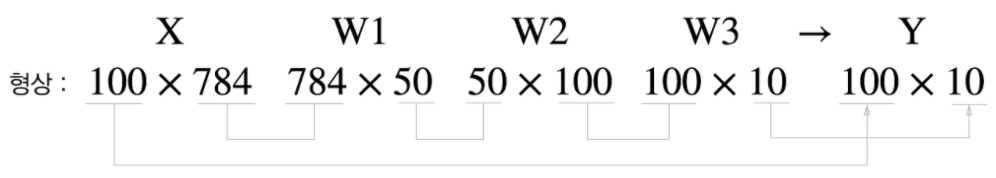 입력 데이터의 형상은 100 X 784, 출력 데이터 형상은 100 X 10이 됩니다.