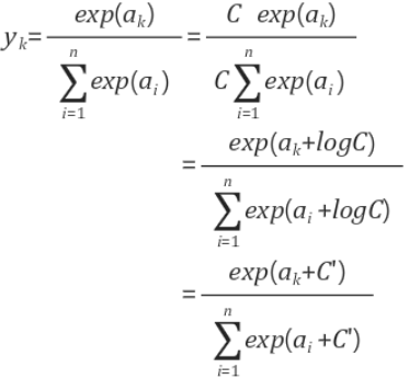이 식이 말하는 것은 소프트맥스의 지수 함수를 계산할 때 어떤 정수를 더해도 ( 혹은 빼도 ) 결과가 바뀌지 않는 다는 것입니다. 오버플로를 막을 목적으로 C를 입력 신호 중 최댓값을 이용하여 빼주는 것이 일반적입니다.
