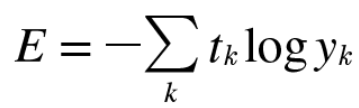 $y_{k}$는 신경망의 출력, $t_{k}$는 정답 레이블입니다. 또, $t_{k}$는 정답에 해당하는 인덱소의 원소만 1이고 나머지는 0입니다.(원-핫 인코딩) 그래서 위 식은 실질적으로 정답일 때의 추정($t_{k}$가 1일 때의 $y_{k}$)의 자연로그를 계산하는 식이 됩니다 (정답이 아닌 나머지 모두 $t_{k}$가 0이므로 log$y_{k}$와 곱해도 0이 되어 결과에 영향을 주지 않습니다.)