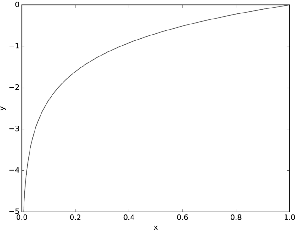 이 그림에서 보듯이 x가 1일 때는 y는 0이 되고, x가 0에 가까워질수록 y의 값은 점점 작아집니다. CEE식도 마찬가지로 정답에 해당하는 출력이 커질수록 0에 다가가다가, 그 출력이 1일 때 0이 됩니다. 반대로 정답일 때의 출력이 작아질수록 오차는 커집니다.