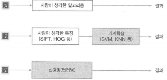 기계학습 - 모아진 데이터로부터 규칙을 찾아내는 역할을 '기계'가 담당합니다. 다만, 이미지를 벡터로 변환할 때 사용하는 특징은 여전히 '사람'이 설계해야 합니다.