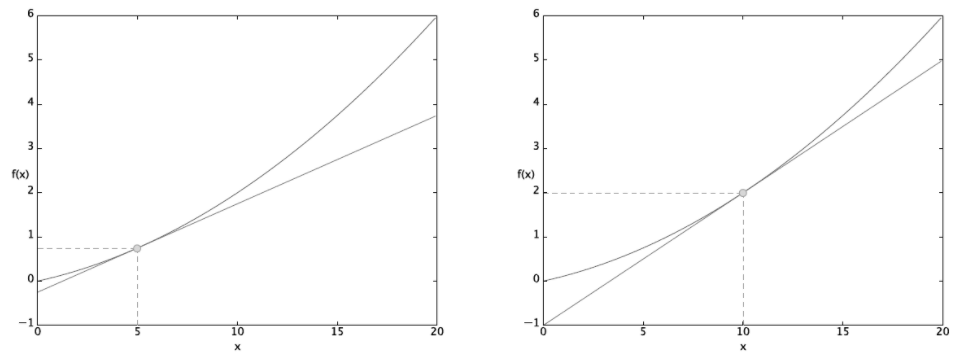 그럼 $x$ = 5 일 떄와 10일 때 이 함수의 미분을 계산해봅시다.