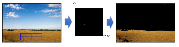 YCrCb 색 공간을 이용합니다. (밝기에 상관없이 색을 검출하기 위함입니다.)