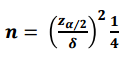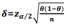 100(1-a)% 신뢰수준에서 허용오차범위가 $\pm\delta$일 때 다음 식을 도출할 수 있습니다.