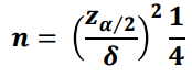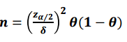 100(1-a)% 신뢰수준에서 허용오차범위가 $\pm\delta$일 때 n(표본크기)은 다음과 같이 구할 수 있습니다.