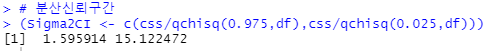 표준편차 신뢰구간 = [1.263295, 3.888762]