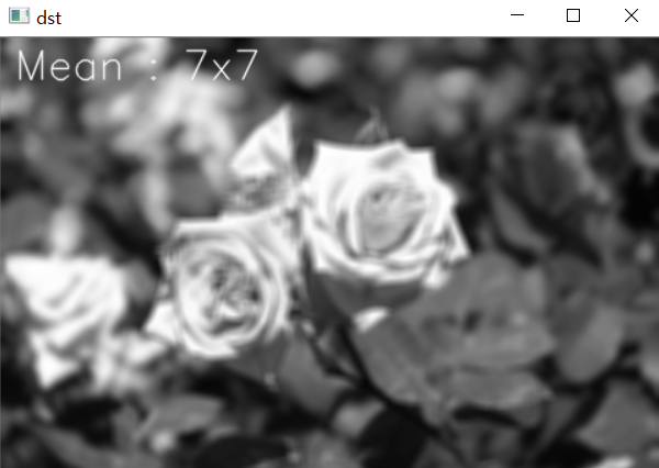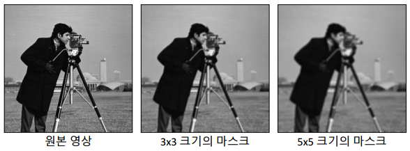 마스크 크기가 커질수록 평균 값 필터 결과가 더욱 부드러워 집니다. 하지만 더 많은 연산량이 필요하게 됩니다.