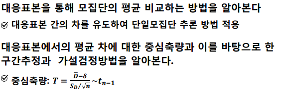 대응표본에서의 평균 차에 대한 중심축량과 이를 바탕으로 한 구간추정과 가설검정방법을 알아보겠습니다.