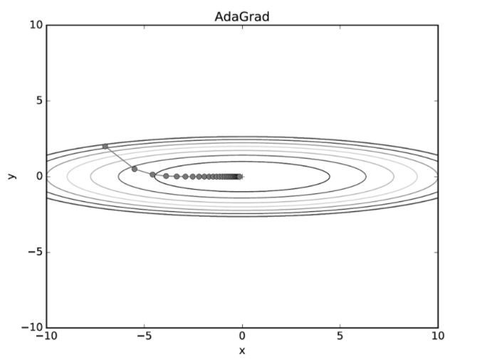 그러면 AdaGrad에 의한 최적화 갱신 경로를 확인해보겠습니다.