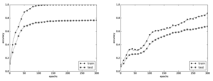 그림과 같이 드롭아웃을 적용하니 훈련 데이터와 시험 데이터에 대한 정확도 차이가 줄었습니다.