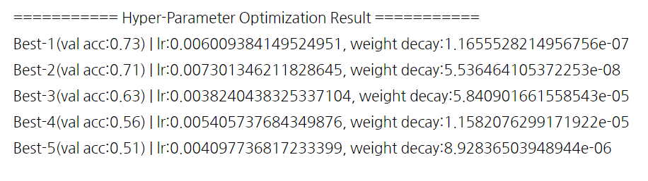 1단계에서 샘플링한 하이퍼파라미터 값을 사용하여 학습하고, 검증 데이터로 정확도를 평가합니다. (단, 에폭은 작게 설정합니다.)
