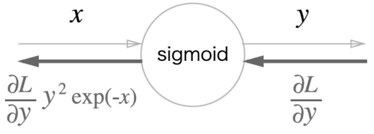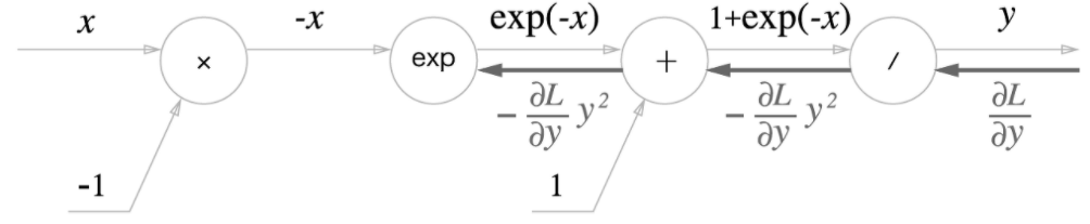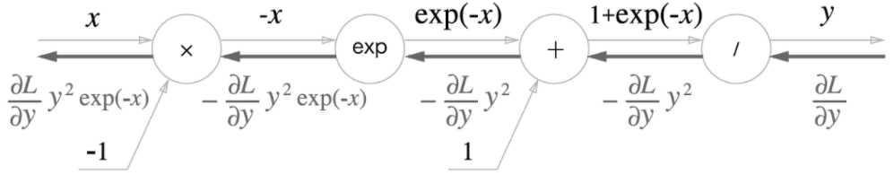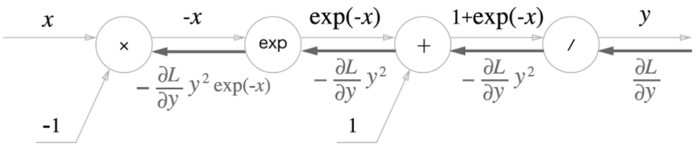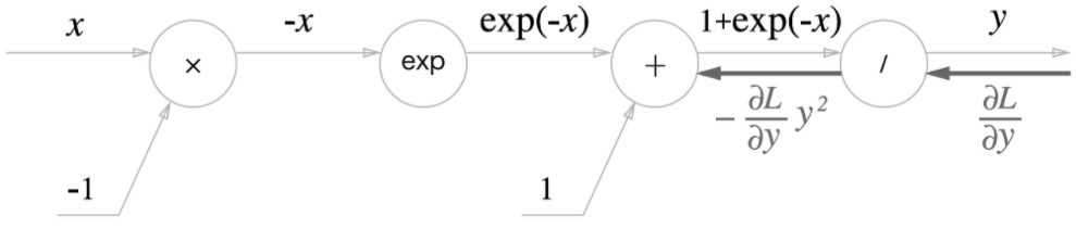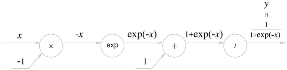 'X'와 '+'노드 말고도 'exp'와 '/'노드가 새롭게 등장했습니다. 'exp'노드는 y = exp(x) 계산을 수행하고 '/' 노드는 y = $\frac{1}{x}$ 계산을 수행합니다. 국소적 계산의 전파로 이뤄지는 것을 확인할 수 있습니다.