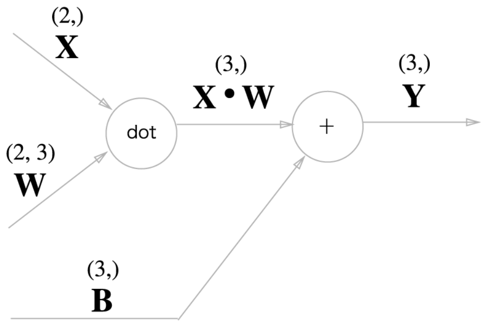그럼 행렬의 곱과 편향의 합을 계산 그래프로 그려보겠습니다. 행렬의 곱을 계산하는 노드를 'dot'으로 표현했습니다. 괄호안의 숫자는 행렬의 형상을 의미합니다.