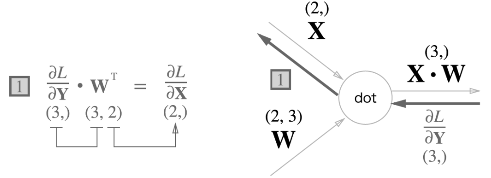 행렬 곱('dot' 노드)의 역전파는 행렬의 대응하는 차원의 원소 수가 일치하도록 곱을 조립해야 합니다. 이를 위해 W와 X를 전치해준 것입니다.