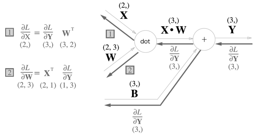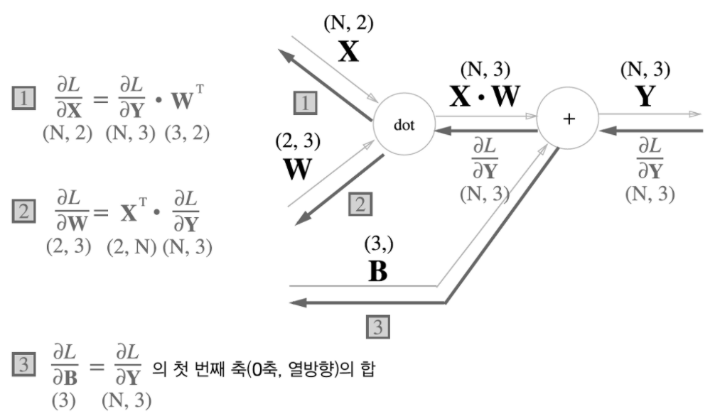 기존과 다른 부분은 입력인 X의 형상이 (N, 2)가 된 것 뿐입니다. 그 뒤로는 지금까지와 같이 계산 그래프의 순서를 따라 순순히 행렬 계산을 하게 됩니다. 또, 역전파 때는 행렬의 형상에 주의하면 $\frac{\partial L}{\partial X}$과 $\frac{\partial L}{\partial W}$은 이전과 같이 도출할 수 있습니다.