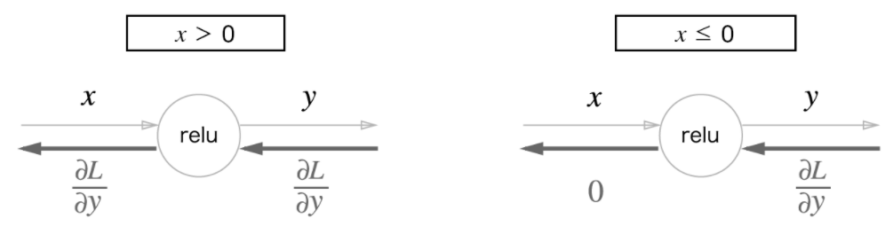 순전파 때의 입력인 x가 0보다 크면 역전파는 상류의 값을 그대로 하류로 흘립니다. 반면, 순전파 때 x가 0 이하면 역전파 때는 하류로 신호를 보내지 않습니다.(0을 보냅니다) 계산 그래프는 아래처럼 그릴 수 있습니다.
