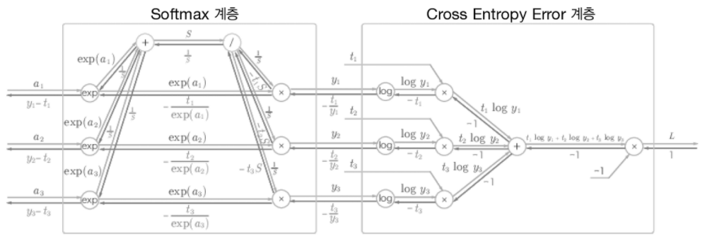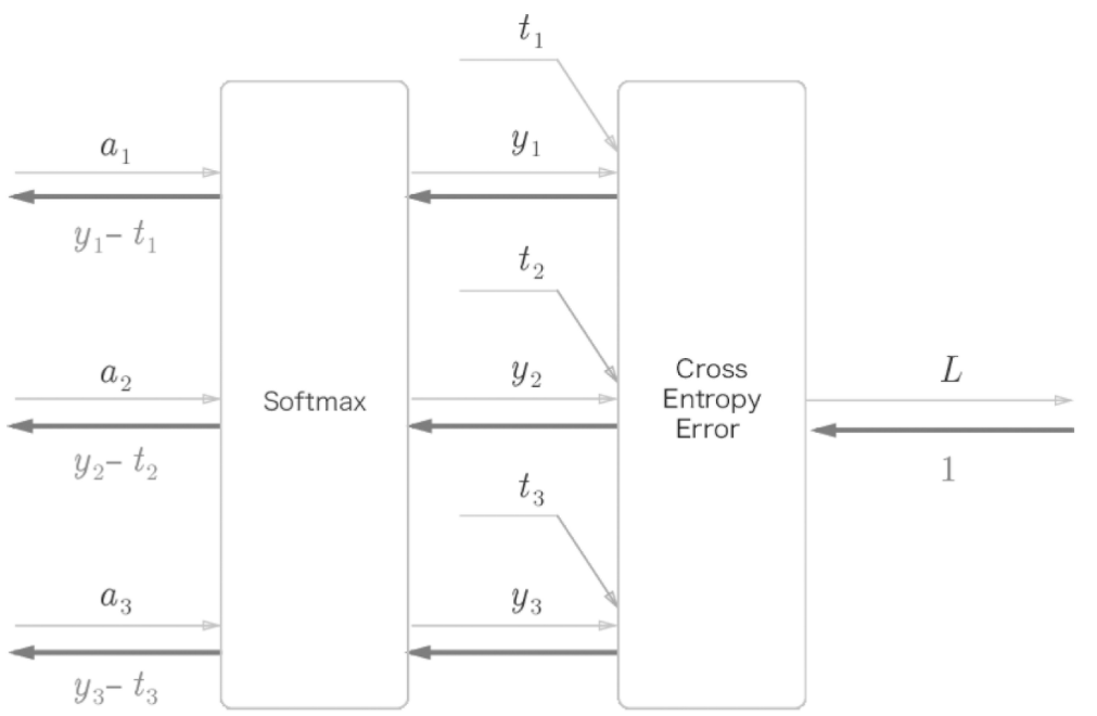 역전파의 결과가 ($y_1 - t_1$, $y_2 - t_2$, $y_3 - t_3$)로 말끔히 떨어지기 때문입니다. 교차 엔트로피 오차라는 함수가 그렇게 설계되었기 때문입니다.