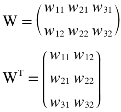 $W^T$는 W의 전치행렬을 뜻합니다. 전치행렬은 W의 (i, j) 위치의 원소를 (j, i)위치로 바꾼 것을 말합니다. 수식으로는 다음과 같이 쓸 수 있습니다. 전치를 한 이유는 행렬의 곱에서는 대응하는 차원의 원소 수를 일치시켜야 하기 때문입니다.