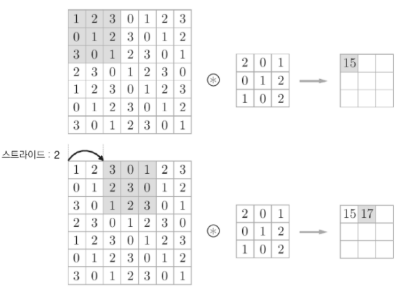 이처럼 스트라이드를 키우면 출력 크기는 작아집니다.
