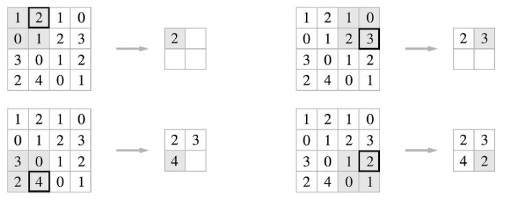 또, 스트라이드는 이 예에서는 2로 설정했으므로 2 X 2 윈도우가 원소 2칸 간격으로 이동합니다.