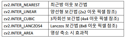 • interpolation: 보간법 지정. 기본값은 cv2.INTER_LINEAR
