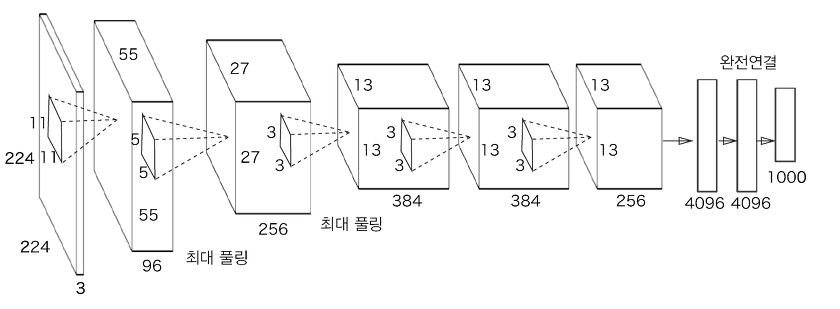 AlexNet은 합성곱 계층과 풀링 계층을 거듭하며 마지막으로 완전연결 계층을 거쳐 결과를 출력합니다.