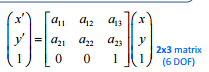어파인 변환은 미지수가 6개이기 때문에 6개의 식이 필요하며 점 3개가 어디로 이동했는지 알면 행렬로 표시할 수 있습니다.