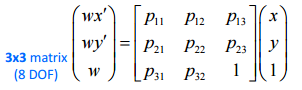 투시변환을 표현하는 행렬은 3X3 행렬이며, 이 중 하나는 비례상수 역할을 하기 때문에 실제 미지수는 8개가 됩니다.