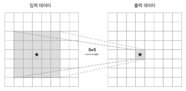 즉, 위 그림의 출력 데이터는 입력 데이터의 5 X 5 영역을 보고 계산하게 됩니다.