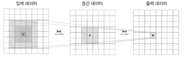 이어서 3 X 3의 합성곱 연산을 2회 반복하는 경우를 생각해보겠습니다.