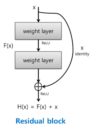 이 단축 경로가 없었다면 두 합성곱 계층의 출력이 F(x)가 되나, 스킵 연결로 인해 F(x) + x가 되는 게 핵심입니다.