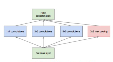 인셉션 구조는 그림과 같이 크기가 다른 필터(와 풀링)를 여러 개 적용하여 그 결과를 결합합니다.