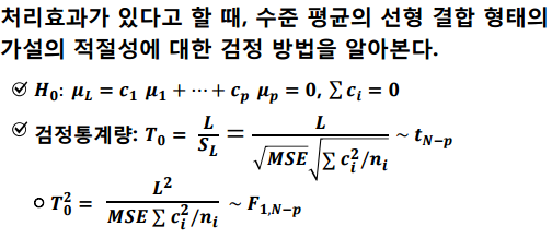 처리효과가 있다고 할 때, 수준 평균의 선형 결합 형태의 가설에 대한 검정 방법을 알아보겠습니다.