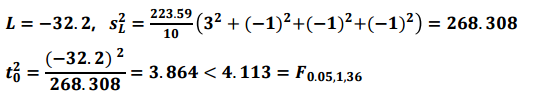 $t_0^2$값이 $F_{0.05,1,36}$보다 작으므로 단백질 원료에 따른 차이가 없다고 볼 수 있습니다.