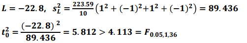 $t_0^2$값이 $F_{0.05,1,36}$보다 큽니다.