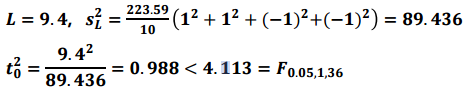 $t_0^2$값이 $F_{0.05,1,36}$보다 작으므로 단백질 원료에 따른 차이가 없다고 볼 수 있습니다.