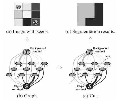 영상의 픽셀을 그래프 정점으로 간주하고, 픽셀들을 두 개의 그룹(객체 그룹, 배경 그룹)으로 분할하는 최적의 컷(Max Flow Minimum Cut)을 찾는 방식입니다.