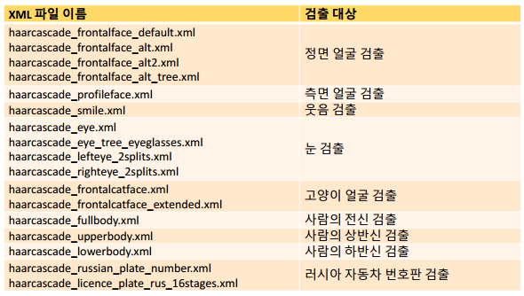 얼굴 검출 용도로 많이 쓰이며 눈, 보행자, 자동차 번호판까지 검출 가능합니다.