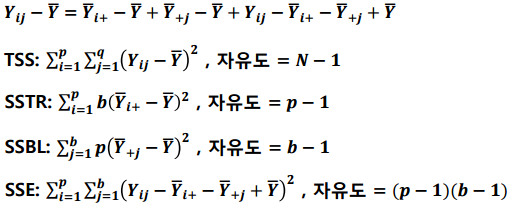 변동분해를 통해 TSS, SSTR, SSBL, SSE를 구하고 검정통계량을 구할 수 있습니다.