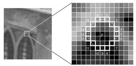 위 그림에서 가운데에 p점이 있고 주변 픽셀을 1번부터 16번까지 번호를 지정합니다.