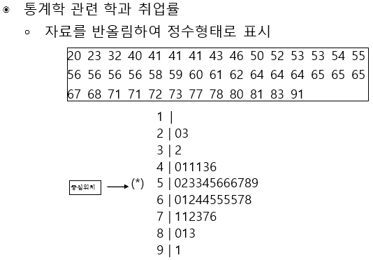줄기-잎 그림은 관측값의 정보를 그대로 간직하면서 자료의 분포를 알려주는 그림입니다.