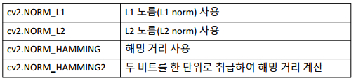 • normType: 특징점 기술자 거리 계산 방식 지정. 기본값은 cv2.NORM_L2.• crossCheck: 이 값이 True이면 양방향 매칭 결과가 같은 경우만 반환함. 기본값은 False.