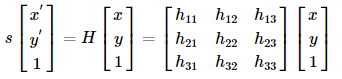 점 4개의 좌표를 알고 이동관계를 알면 8개의 식이 도출되어 8개의 미지수를 구해 투시변환 행렬을 구할 수 있습니다.