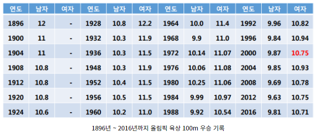 올림픽 육상 100m 남자 우승기록에서 기울기를 추론해보겠습니다.