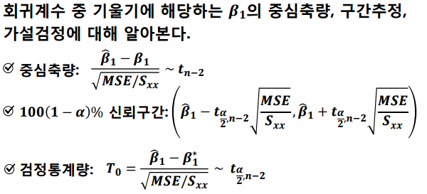 회귀계수 중 기울기에 해당하는 $\beta_1$의 중심축량, 구간추정, 가설검정에 대해 알아보겠습니다.