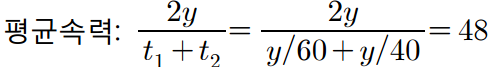문제 - 전체 구간의 반을 60km/h, 나머지를 40km/h일때 평균속력을 구해라.