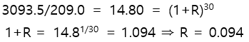 문제2 - 1인당 총소득 1985년 209만원, 2015년 3094.5만원이라고 할 때 연평균 증가율($(최종값/최초값)^{1/n}$)