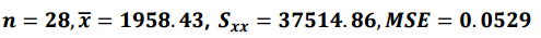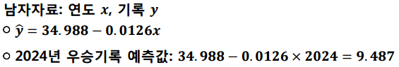 위의 남자 자료를 통해 2024년 우승기록에 대한 예측구간을 구해보겠습니다.