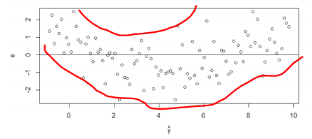 a. $\hat{y}$가 커지면서 e의 폭이 커짐